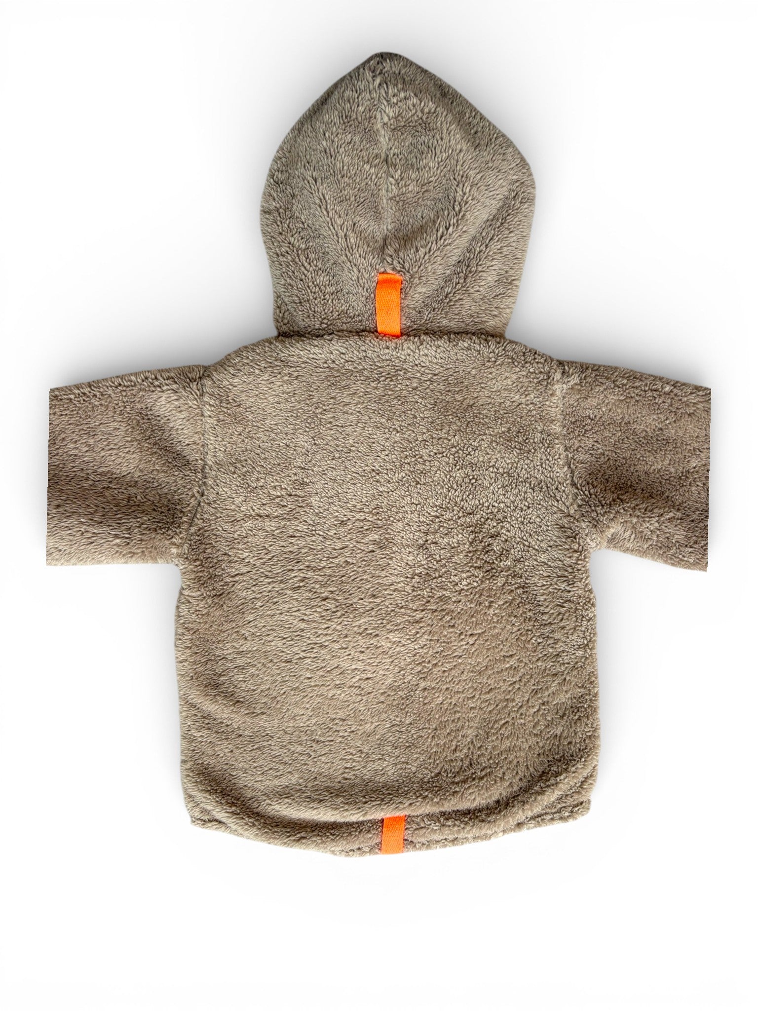 Ultra-soft Koeka fleece hoodie in warm beige, featuring cozy teddy fleece material perfect for chilly days. This Dutch premium brand piece includes functional hood with bear ears detail, front zipper for easy dressing, a faux pocket at the tummy which snaps, and bright orange accents. Koeka is renowned for creating high-quality baby textiles with modern design and exceptional comfort. The plush fleece material provides excellent warmth without bulk.